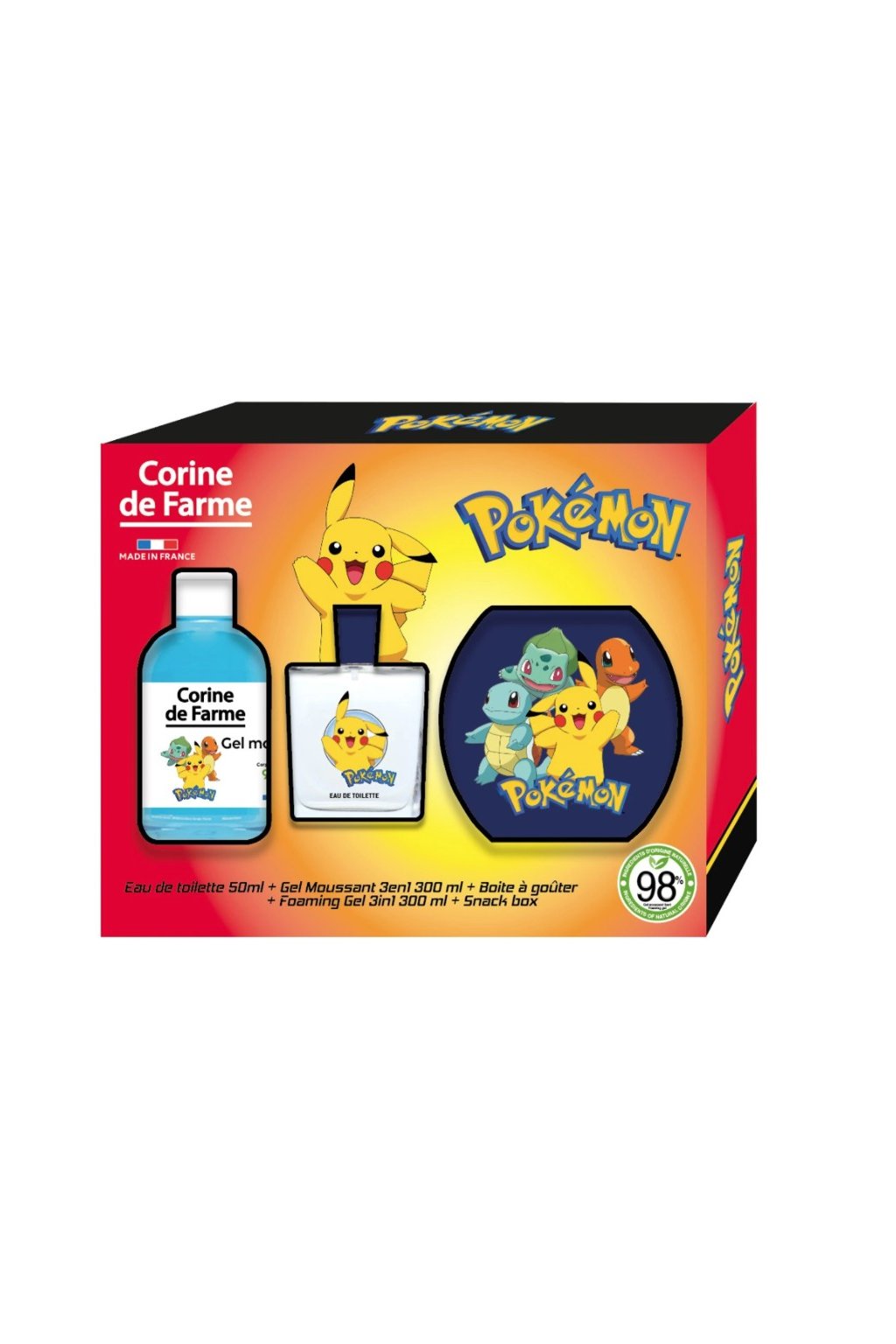 Corine de Farme – Pokémon Gift Set for Children je zábavná a praktická sada pro malé fanoušky Pokémonů, která obsahuje toaletní vodu Apple Gourmande 50 ml, 3v1 pěnový gel 300 ml a dárkovou krabičku. Sada je navržena tak, aby děti mohly bezpečně a hravě objevovat zábavnou a šetrnou péči o tělo a vlasy. Toaletní voda má svěží, ovocnou vůni jablek, která je jemná a vhodná pro citlivou dětskou pokožku. Pěnový gel 3 v 1 kombinuje funkce sprchového gelu, šamponu a koupele, díky čemuž je mytí snadné a zábavné. Všechny produkty jsou hypoalergenní, bez parabenů a šetrné k pokožce, ideální pro každodenní použití. Praktické balení v dárkové krabičce dělá z této sady skvělý dárek pro děti, které milují Pokémon a hravou péči o sebe.