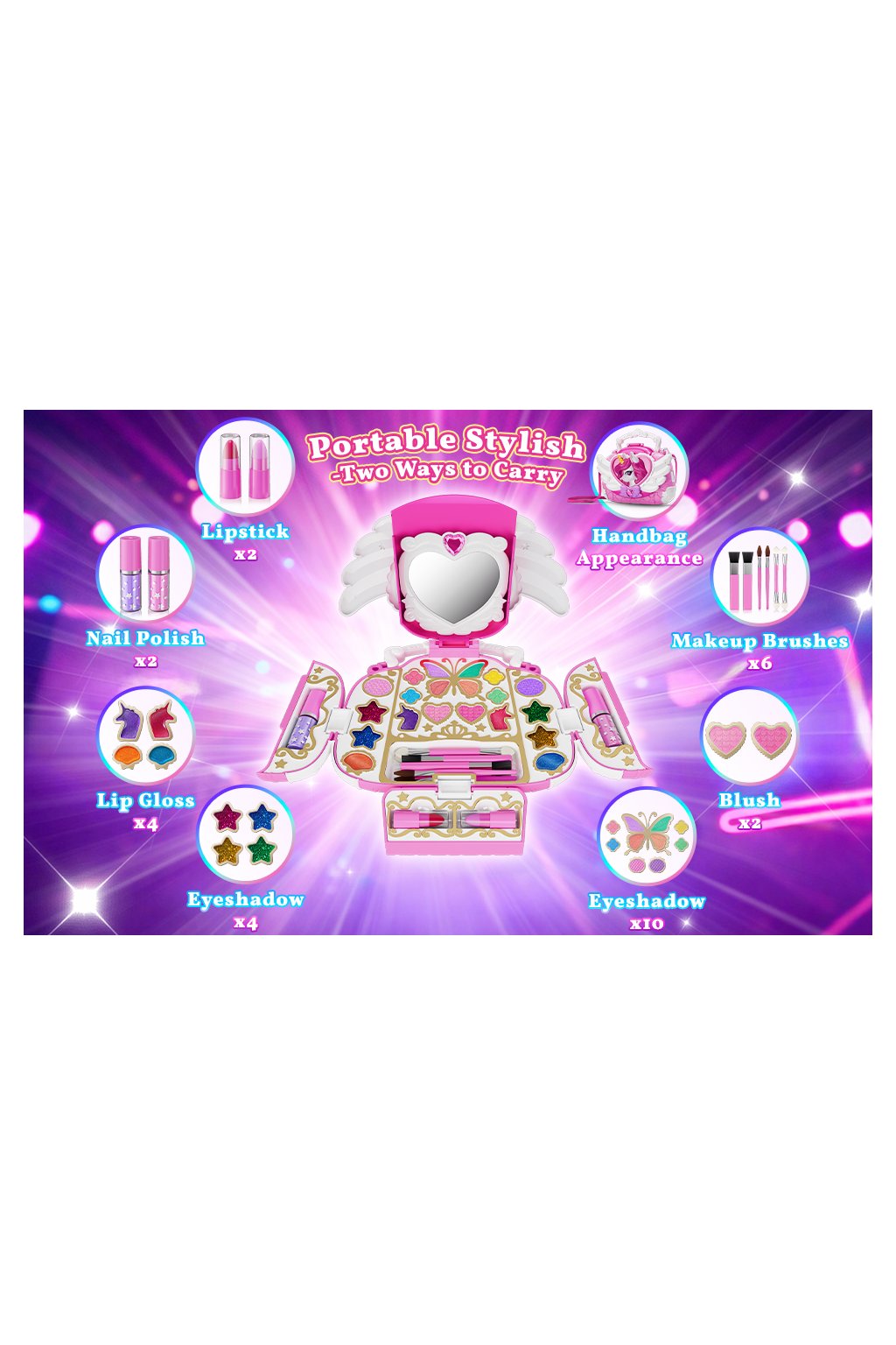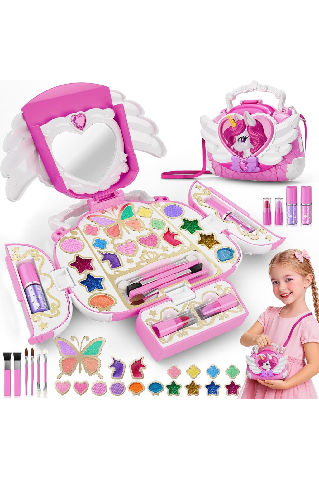 Dětská kosmetická sada s jednorožci pro dívky ve věku 3–12 let je kompletní, bezpečná a omyvatelná sada pro malé princezny, které chtějí objevovat svět kosmetiky hravou a kreativní formou. Sada obsahuje 2 rtěnky, 2 laky na nehty, 4 lesky na rty, 4 třpytivé oční stíny, 10 klasických očních stínů, 2 kosmetické houbičky a 6 štětců, vše v praktickém balení se zrcátkem a poutkem pro snadné použití. Produkty jsou šetrné k dětské pokožce, omyvatelné vodou a netoxické, takže dívky se mohou naučit techniky líčení hravým a bezpečným způsobem bez jakéhokoli rizika. Kreativní design s motivem jednorožce a princezny podněcuje zábavu a fantazii a všechny produkty jsou vhodné pro každodenní hraní i pro zvláštní příležitosti. Tato sada je ideální jako dárek pro malé holčičky, které si chtějí bezpečně a hravě vyzkoušet líčení.