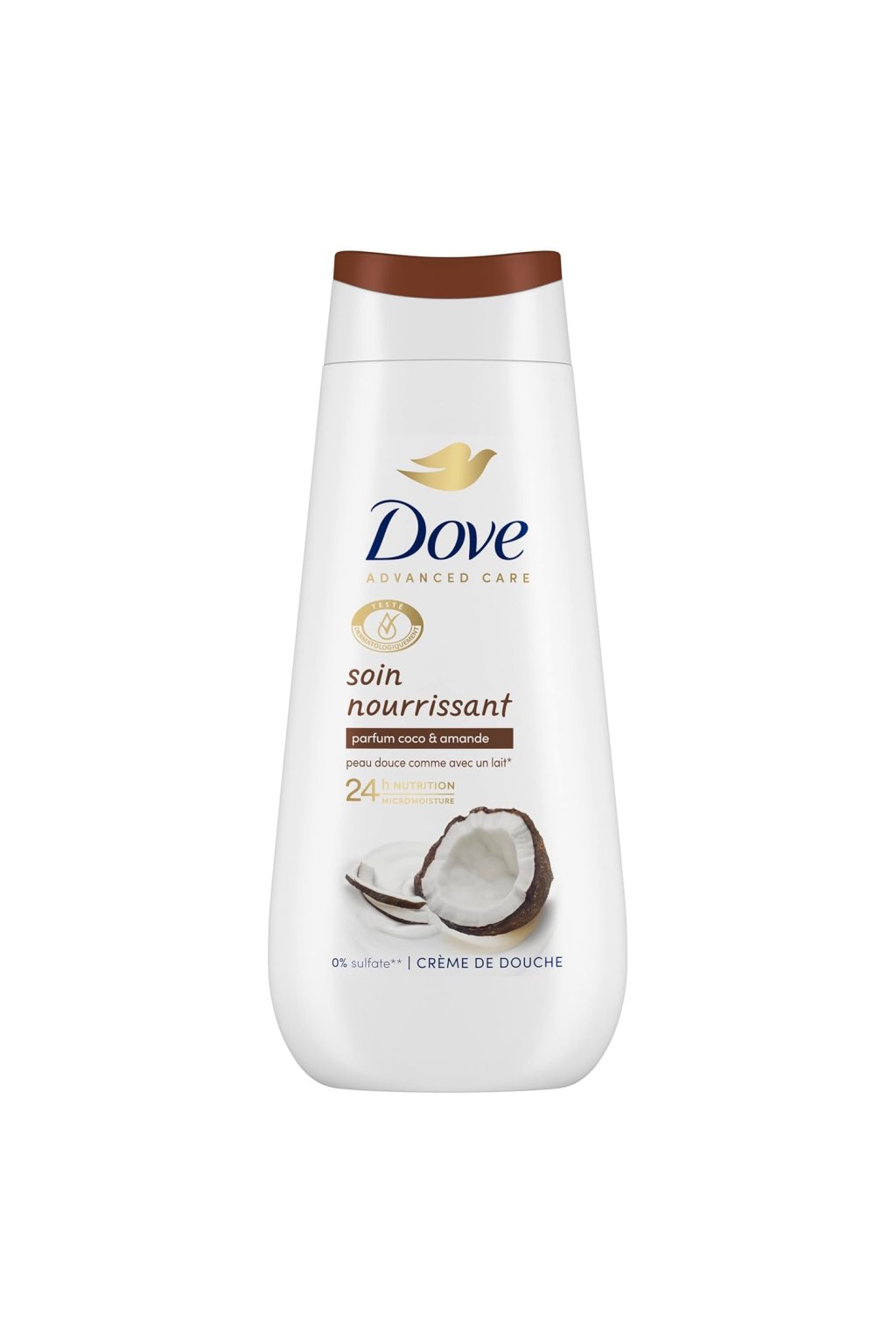 Sprchový krém Dove díky hydratačním přípravkům na rostlinné bázi, kokosovému oleji a mandlím regeneruje suchou pokožku
