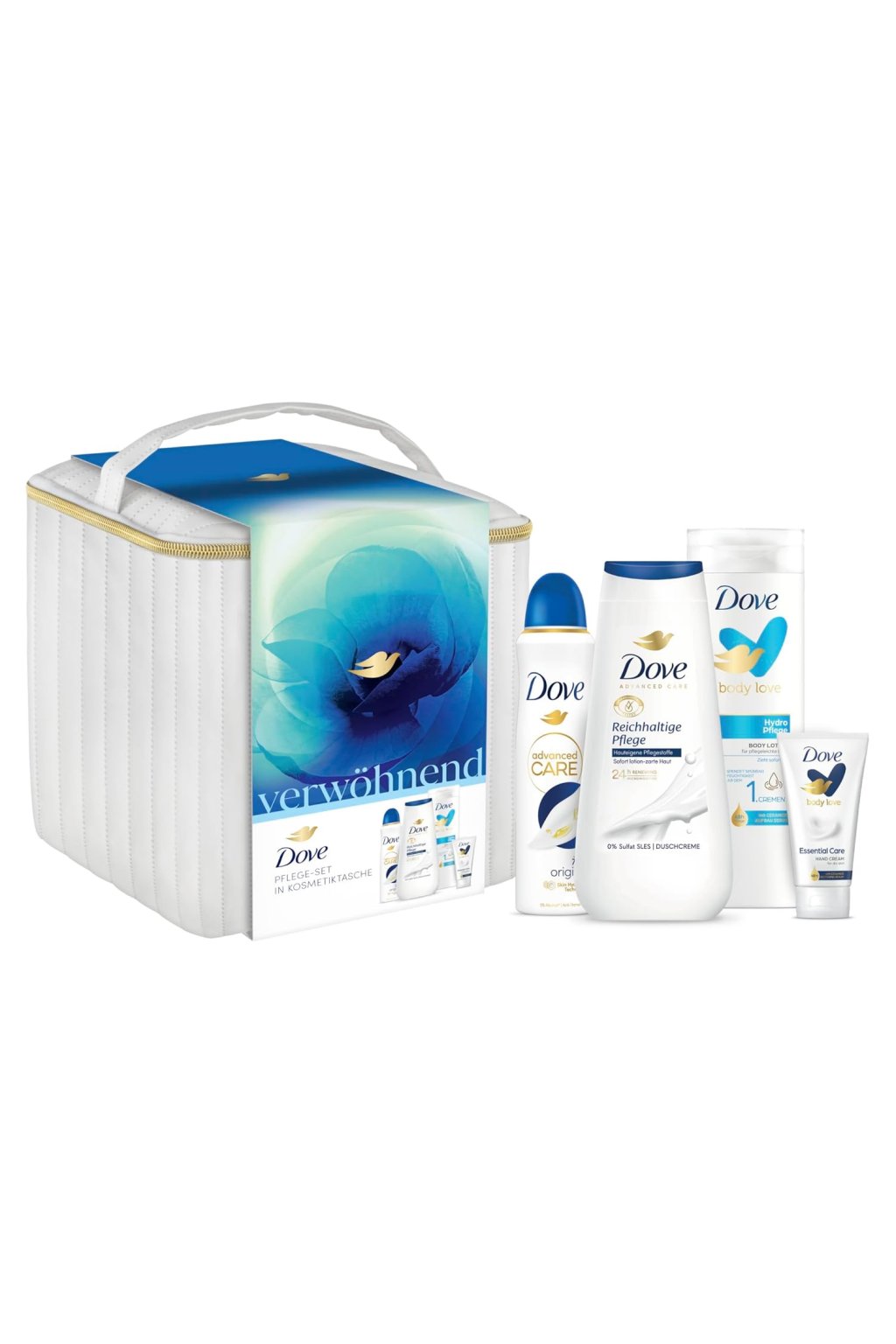 Dove Pampering Gift Set s antiperspirantem, sprchovým krémem, krémem na ruce, tělovým mlékem a kosmetickou taštičkou (150 ml + 225 ml + 400 ml + 75 ml)