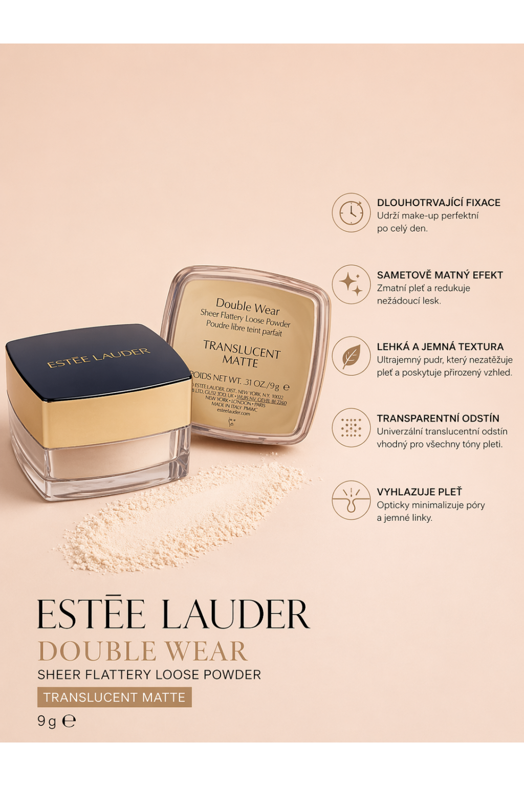 Sypký pudr Estée Lauder Double Wear Sheer Flattery Loose Powder je ideální volbou pro dokonalé zafixování make-upu a celodenní kontrolu lesku. Jeho ultrajemná textura se lehce nanáší, sjednocuje pleť a vytváří sametově matný finiš bez pocitu zatížení.