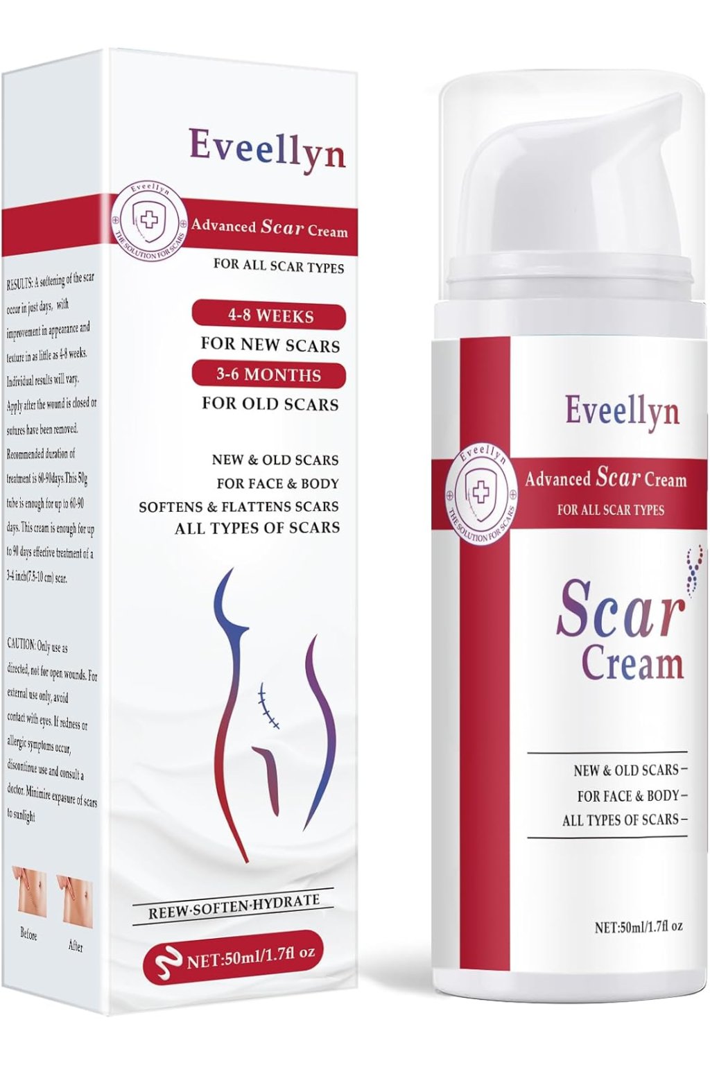 ÚČINNÁ NA RŮZNÉ TYPY JIZV - Eveellyn pomáda na jizvy účinně bojuje proti různým typům jizev a podporuje tvorbu kolagenu a regeneraci buněk. Lze ji použít na jizvy po císařském řezu, strie, popáleniny, jizvy po poranění, hypertrofické jizvy, jizvy po akné a další. Vhodný na více oblastí, jako je obličej, nohy, paže a záda.