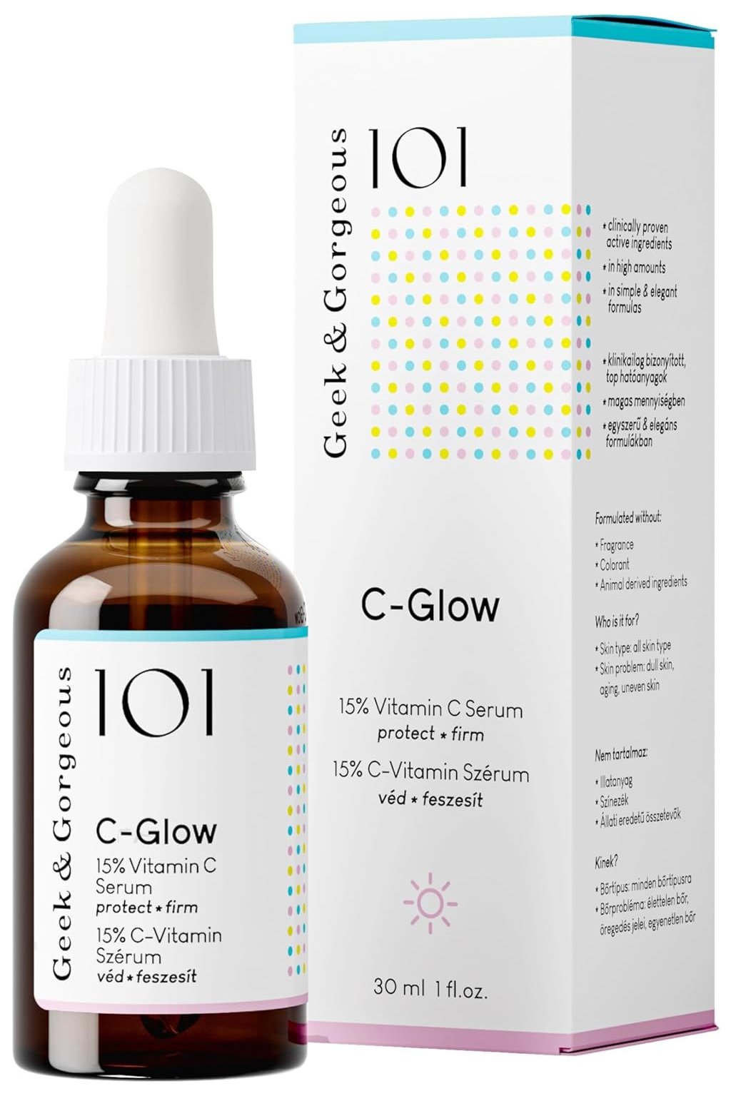 Geek & Gorgeous 101 C-Glow – 15 % Vitamin C sérum 30 ml je intenzivní sérum s vysokou koncentrací vitamínu C, navržené pro rozjasnění pleti, sjednocení tónu a boj proti známkám únavy či hyperpigmentaci.
