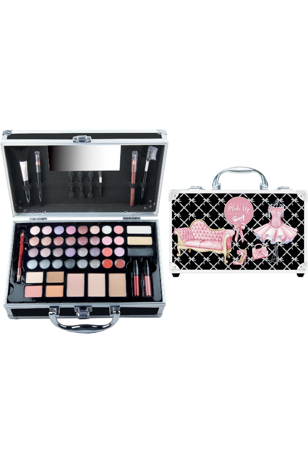 Kosmetická taštička Glam obsahuje 24 očních stínů, 8 balzámů na rty, 4 tvářenky, 2 lesky na rty v tubách, 3 pudry, 3 krémové oční stíny, 2 oční tužky, 1 dvojitou tužku na rty a 6 kosmetických štětců. Pouzdro je vybaveno chytrým organizačním systémem s vyhrazenými přihrádkami a kosmetickými štětci pro přesnou aplikaci. Kovové provedení a pevné spony nejen chrání vaše produkty, ale také dodávají pouzdru nádech luxusu.