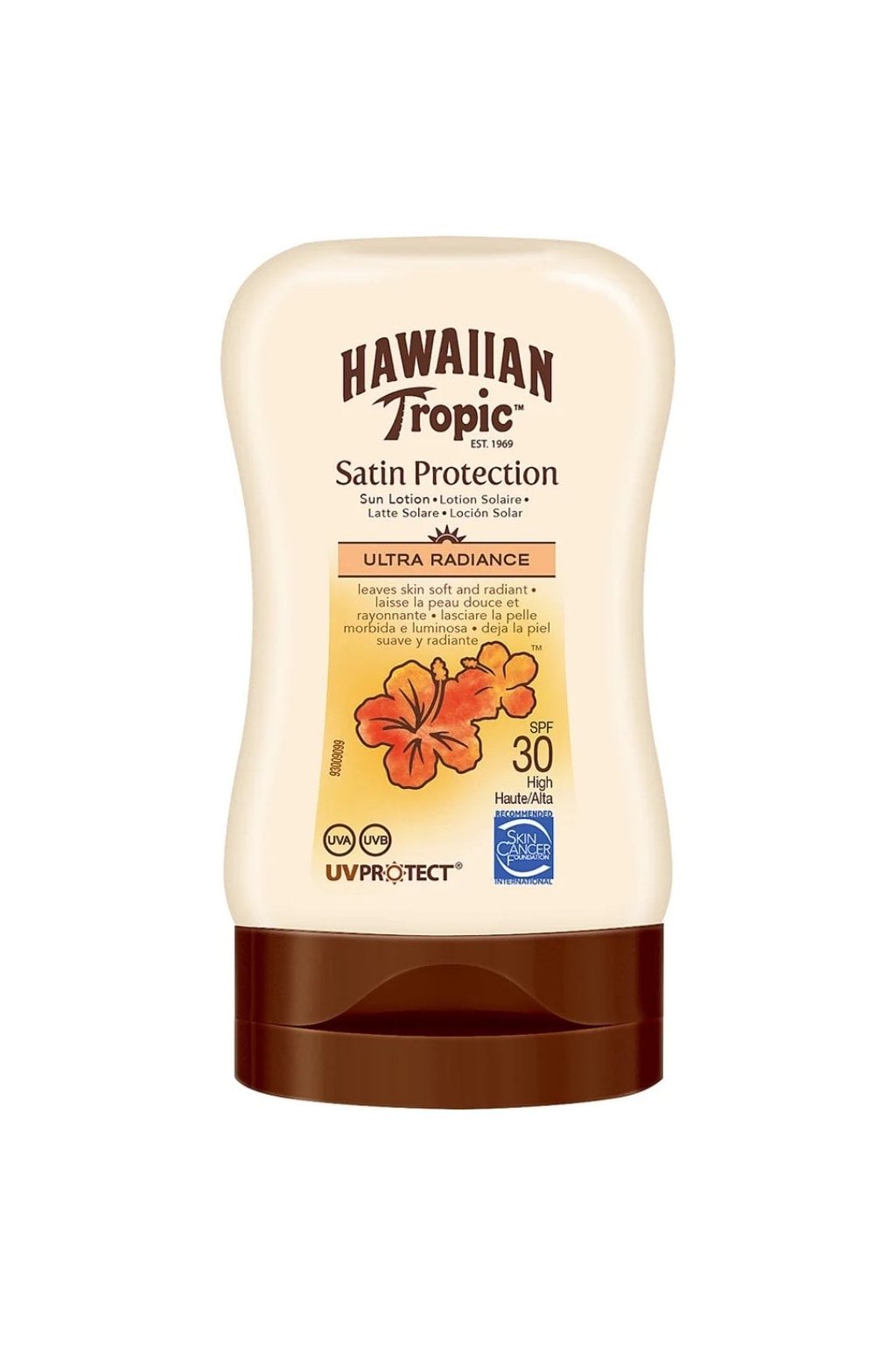 Hawaiian Tropic Satin Protection Ultra Radiance Sun Lotion SPF30 (100 ml) je voděodolný krém na opalování s obsahem rostlinných látek inspirovaných ostrovy, bambuckého másla a výtažku z manga, který zjemňuje pokožku, zvyšuje její zářivost a zároveň poskytuje středně silnou širokospektrální UVA a UVB ochranu.