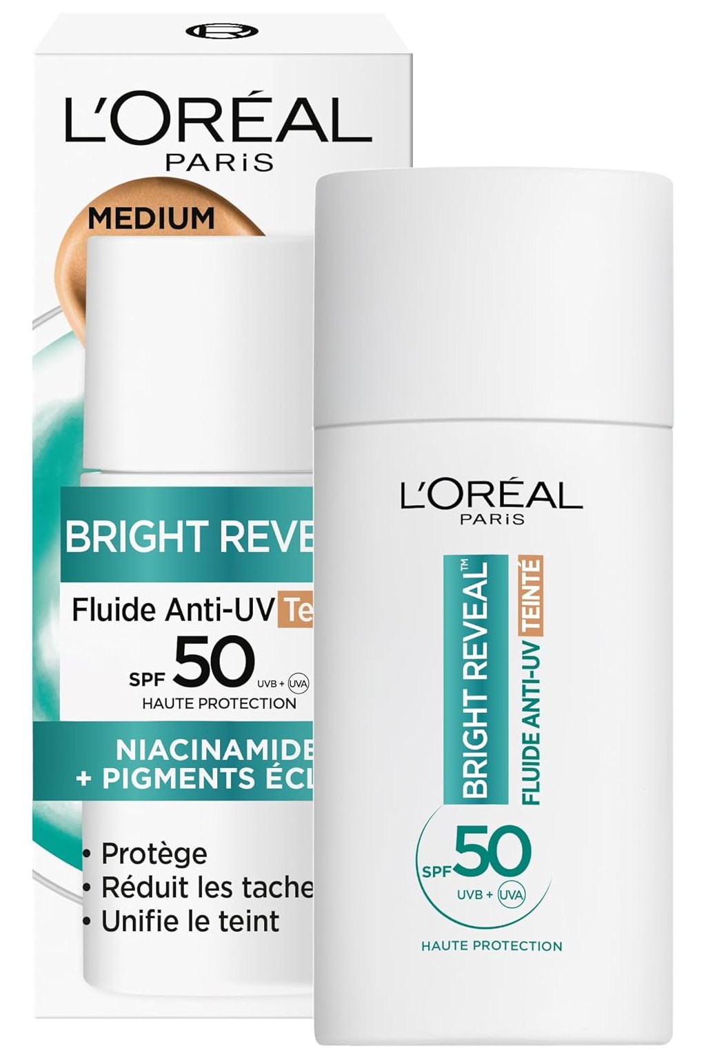 L'Oréal Paris Bright Reveal Anti-UV Fluid SPF 50 střední odstín Niacinamid 50 ml je lehký ochranný fluid, který kombinuje vysokou ochranu proti UV záření s rozjasňujícím účinkem. Obsahuje niacinamid, který pomáhá sjednotit tón pleti, zjemnit tmavé skvrny a dodat pokožce přirozený jas. Fluid se rychle vstřebává, nezanechává mastný film a poskytuje dlouhotrvající pocit svěžesti a hydratace. Díky SPF 50 chrání pleť před slunečními paprsky a předčasným stárnutím. Produkt je vhodný pro střední odstíny pleti a ideální pro každodenní použití jako součást denní péče.