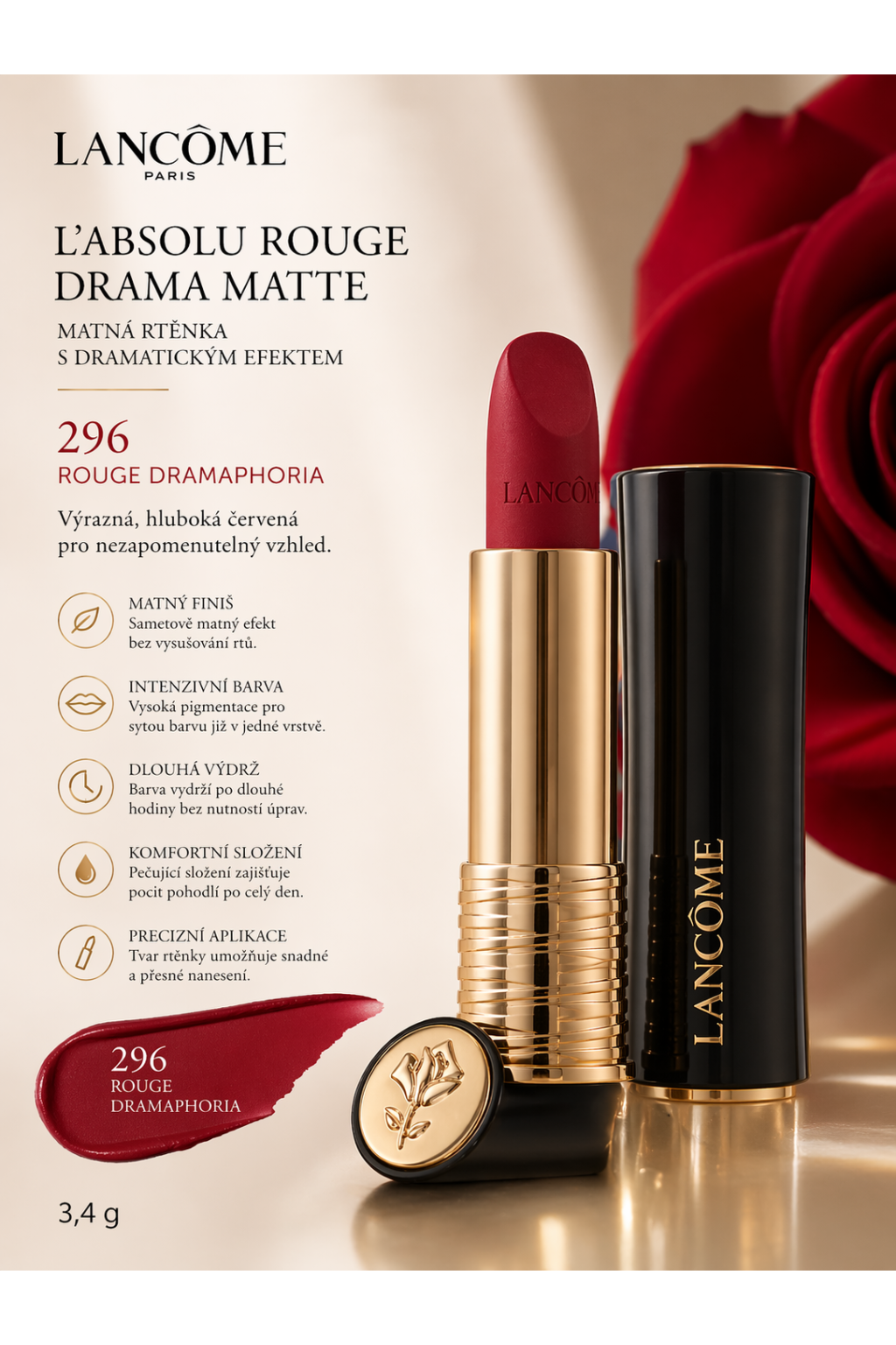 Lancôme L’Absolu Rouge Drama Matte – odstín 296 Rouge Dramaphoria 3,4g