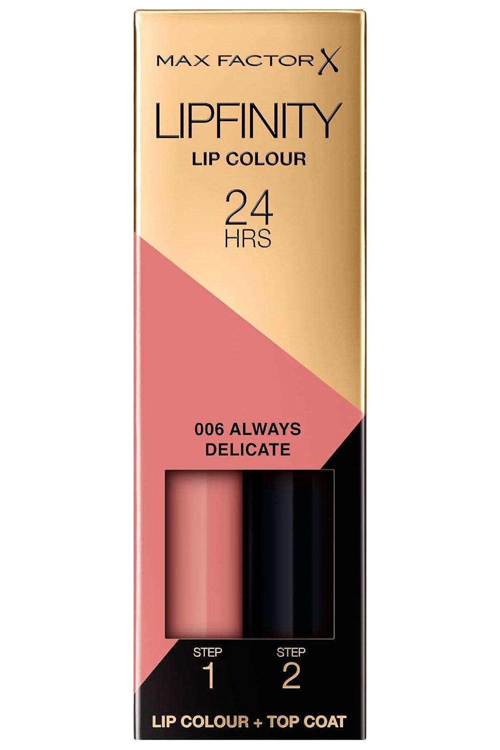 Max Factor Lipfinity Long-Lasting Two Step Lipstick – odstín 006 Always Delicate, 4,2 g je dlouhotrvající dvoufázová tekutá rtěnka, která poskytuje intenzivní a stabilní barvu až 24 hodin. Systém two step kombinuje pigmentovanou barevnou složku (krok 1) s vrchním lesklým top coatem (krok 2), který barvu „uzavře“, dodá jí lesk a zároveň hydratuje a chrání rty. Tento proces zajišťuje dlouhotrvající a rovnoměrné krytí bez vysušování rtů.