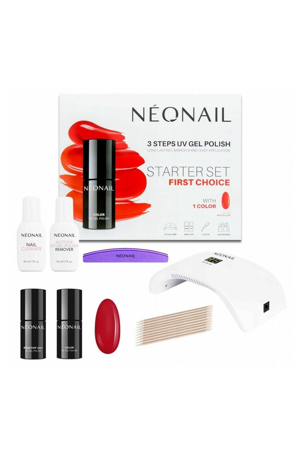 Startovací sada First Choice obsahuje leštidlo 2v1, základnu a vrchní část, LED lampu, čisticí prostředek, aceton, pilník a oranžové hobliny.