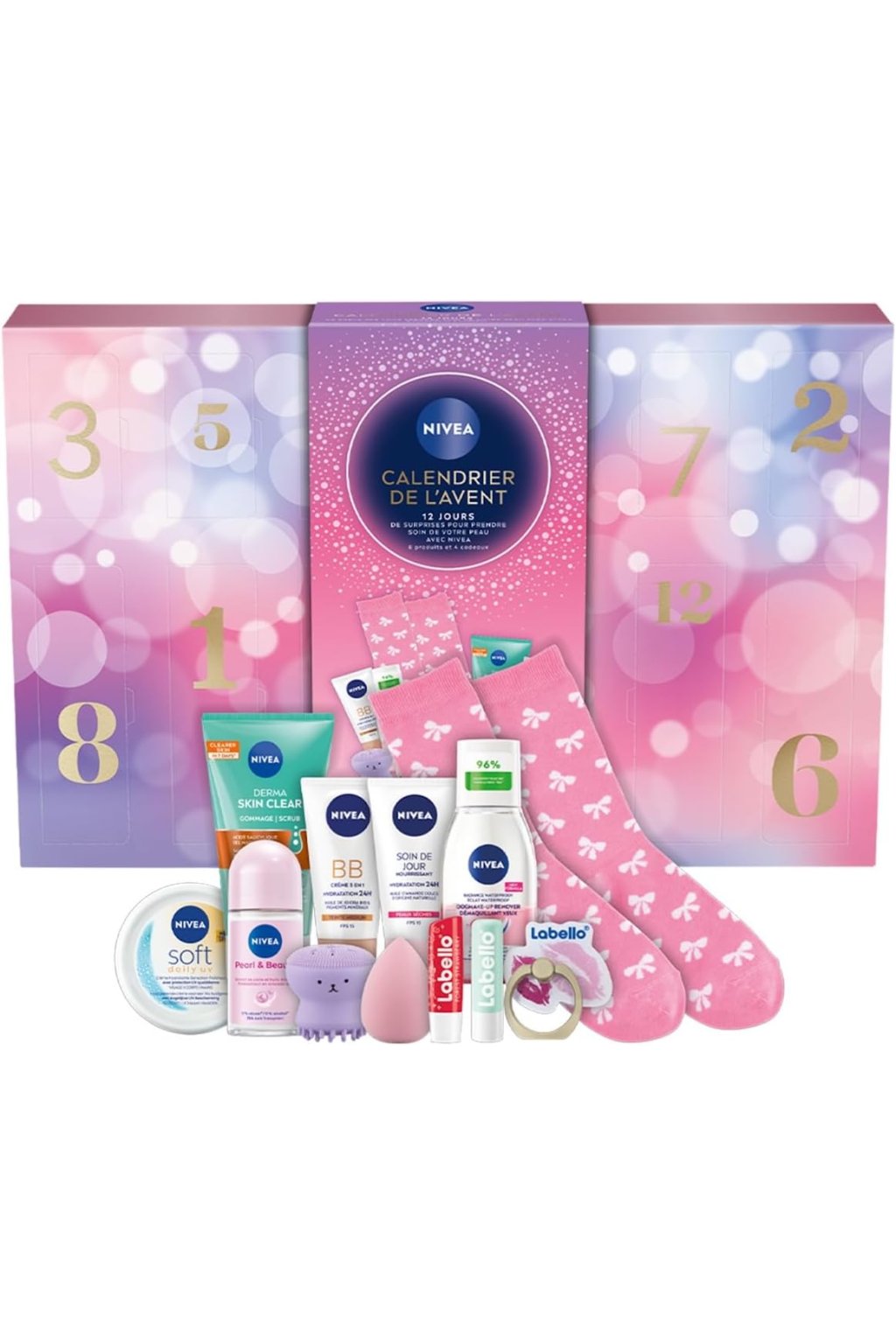 Adventní kalendář NIVEA 2025 obsahuje: 8 základních produktů NIVEA: 1 x 50 ml 24H denní péče, 1 x 50 ml BB krém 24H hydratace, 1 x 200 ml Soft Pot SPF 15, 1 x 125 ml dvoufázový voděodolný odličovač očních make-upů, 1 x 1,7 fl oz Pearl & Beauty Ball, 1 x 150 ml exfoliátor, 1 x Labello Disney Princess Rapunzel, 1 x Labello Aloe Vera exfoliátor. 4 kosmetické doplňky: blender, čisticí prostředek na obličej, ponožky, kroužek na telefon.