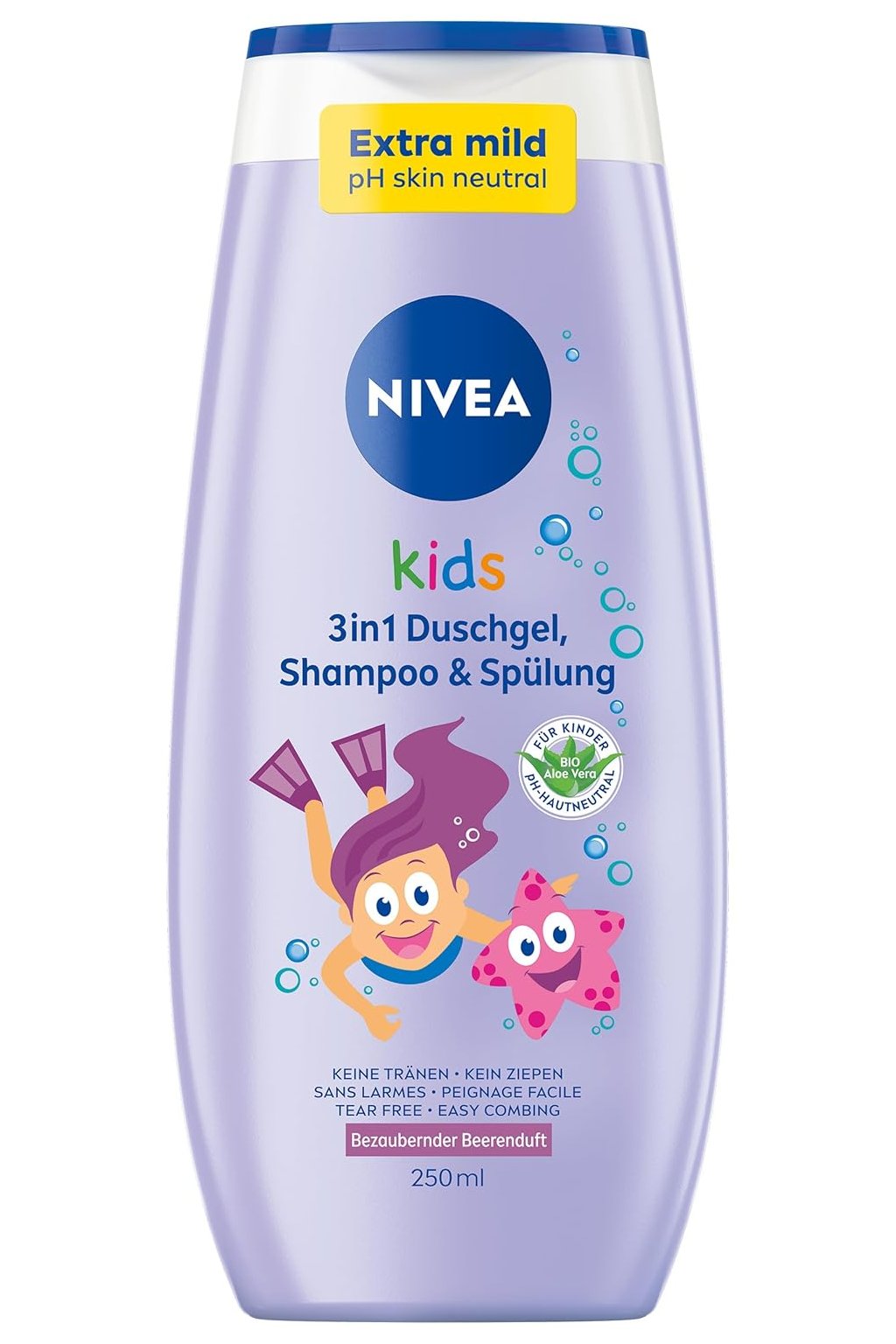 NIVEA Kids 3v1 je extra jemný sprchový gel, šampon a kondicionér v jednom, speciálně vyvinutý pro citlivou dětskou pokožku a vlasy. Díky složení pH neutrálnímu k pokožce šetrně čistí, nevysušuje a podporuje přirozenou ochrannou bariéru kůže.