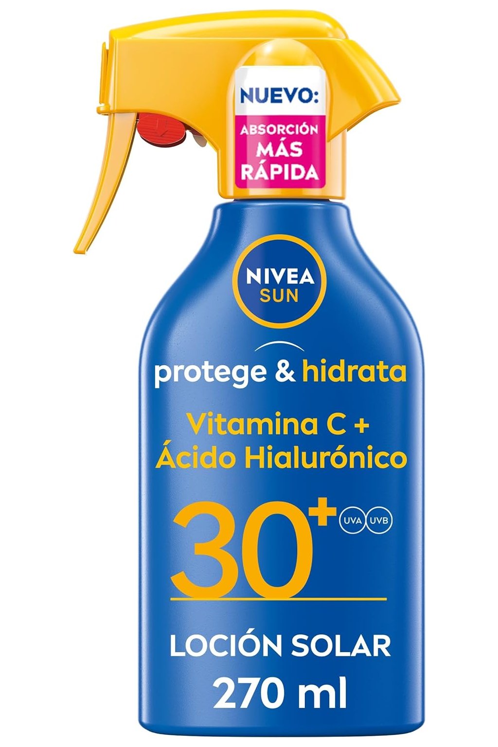 NIVEA SUN Protege & Hidrata opalovací sprej SPF 30, 270 ml poskytuje středně vysokou ochranu před UVA a UVB zářením a zároveň intenzivně hydratuje pokožku během pobytu na slunci. Lehké, nemastné složení se rychle vstřebává, nezanechává lepkavý pocit a udržuje pokožku hebkou a pružnou. Obohacený o antioxidanty pomáhá předcházet poškození buněk způsobenému volnými radikály a chrání před předčasným stárnutím. Praktický sprej umožňuje snadnou a rovnoměrnou aplikaci, díky čemuž je ideální na pláž, sport i každodenní použití. Je voděodolný a dermatologicky testovaný.