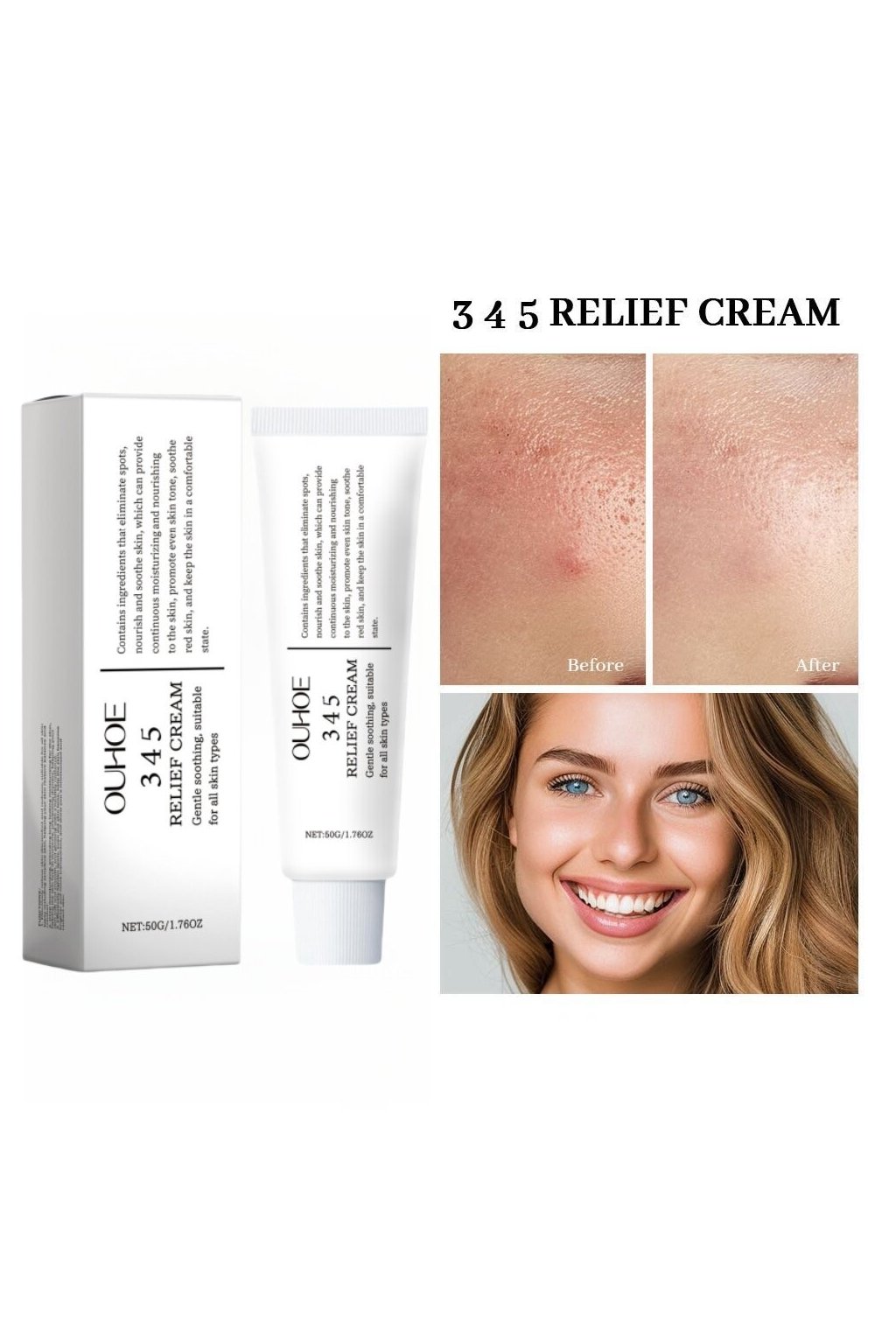 345 Relief Cream Korejský veganský krém proti skvrnám 50 g je výjimečný krém navržený speciálně pro regeneraci pokožky a odstranění viditelných nedokonalostí pleti, jako jsou skvrny, jemné jizvy nebo začervenání. Tento veganský krém má lehkou a jemně hydratační texturu, která se rychle vstřebává, aniž by zanechávala mastný pocit. Obsahuje kombinaci přírodních složek, jako je extrakt z aloe vera a růže, které mají zklidňující účinky a podporují regeneraci pokožky. Dále je obohacen o vitamín C a niacinamid, které rozjasňují pleť a zpevňují její strukturu.