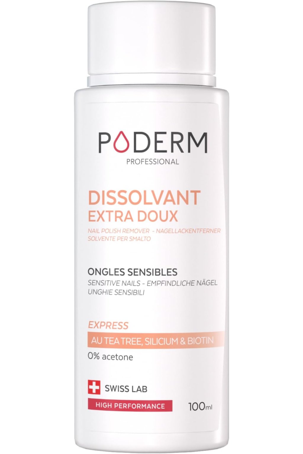 Poderm Extra jemný bezacetonový odlakovač s tea tree olejem je šetrný odlakovač bez acetonu, který je určen pro citlivé, oslabené a poškozené nehty i okolní pokožku. Tento speciální odlakovač účinně odstraňuje lak z nehtů, aniž by je vysušoval, oslaboval nebo narušoval jejich přirozenou strukturu. Díky jemnému složení je vhodný pro časté používání i pro nehty se sklonem k lámání, třepení nebo poškození.