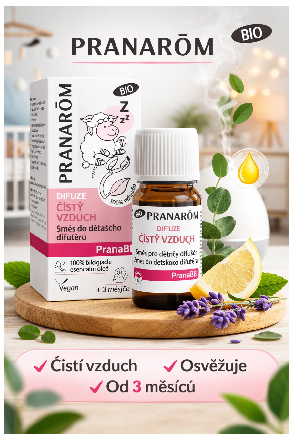 Aromaterapeutická směs Pranarôm PranaBB Difuze Purificator je navržena pro přirozené čištění a osvěžení vzduchu v dětském pokoji. Obsahuje 100% BIO esenciální oleje, které pomáhají vytvářet zdravější prostředí, neutralizovat nepříjemné pachy a podpořit komfortní dýchání miminek již od 3 měsíců.