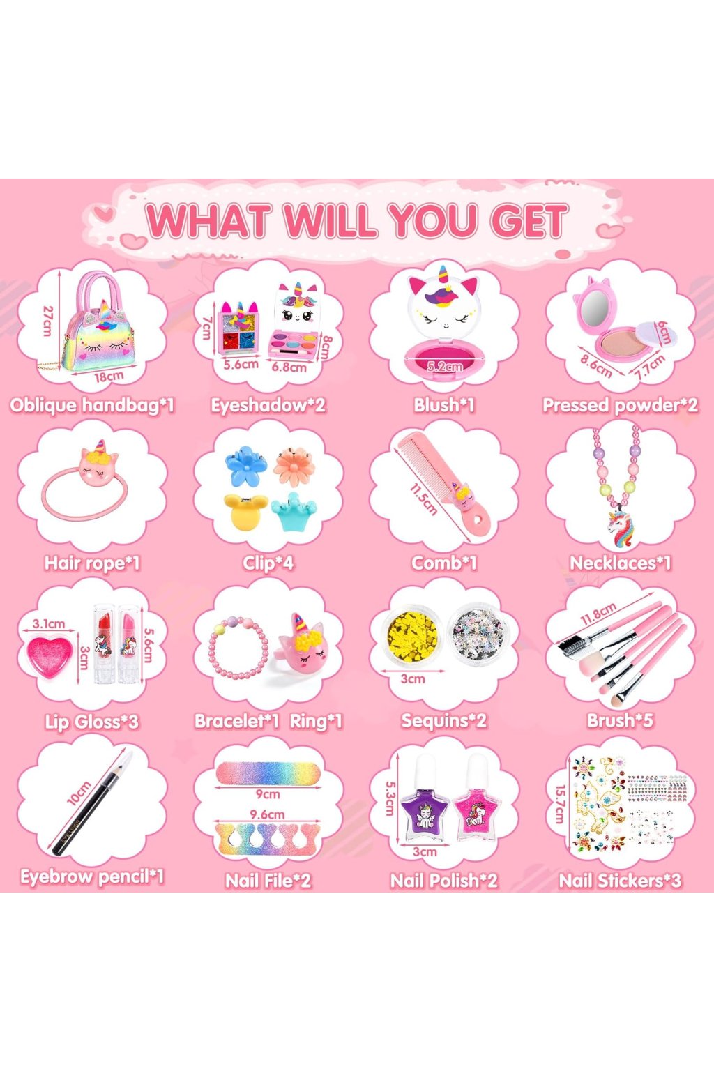 RDDAIPE Unicorn Make-up Washable Children's Make-up Set – 33 pieces je hravá a bezpečná kosmetická sada pro děti, která kombinuje make-up, doplňky a zábavu v jednom roztomilém balení s motivem jednorožce. Sada obsahuje tašku s motivem jednorožce, 2 oční stíny, tvářenku, 2 pudry, 3 lesky na rty, oční linku, 2 laky na nehty, 3 samolepky na nehty, 2 pilníky na nehty, 2 flitry, 2 štětce, hřeben, gumičku do vlasů, 4 sponky do vlasů, náhrdelník, náramek a prsten. Make-up je smyvatelný vodou, netoxický a šetrný k dětské pokožce, takže je vhodný pro každodenní hraní i oslavy. Sada podporuje kreativitu, představivost a jemnou motoriku a je ideálním dárkem pro malé princezny.