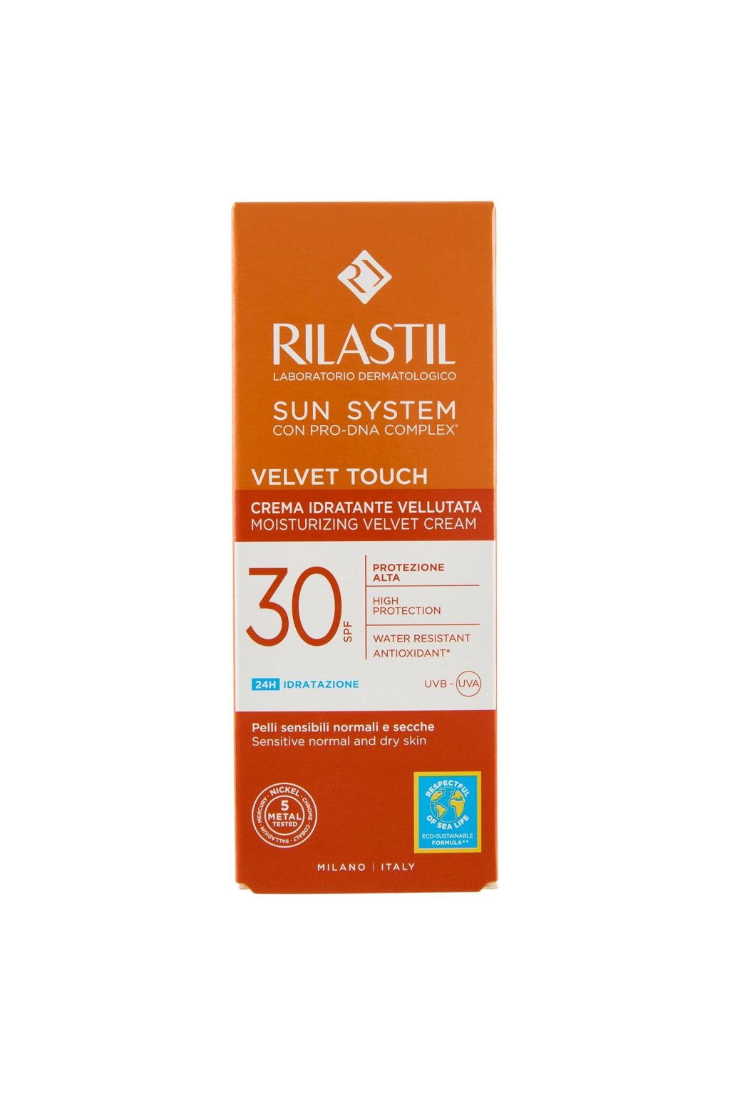 Rilastil Sun System jemný hydratační krém na obličej SPF30 50 ml je lehký opalovací krém pro všechny typy pleti, včetně citlivé. Poskytuje širokospektrální ochranu před UVA a UVB zářením, chrání před spálením a fotostárnutím. Díky Pro-DNA Complexu podporuje pružnost pokožky a bojuje proti vráskám. Obsahuje kyselinu hyaluronovou a glycerin, které intenzivně hydratují a zanechávají pleť hebkou. Voděodolná, nekomedogenní textura se rychle vstřebává bez bílých skvrn. Nanášejte před sluněním rovnoměrně na obličej a krk, opakujte každé 2 hodiny.