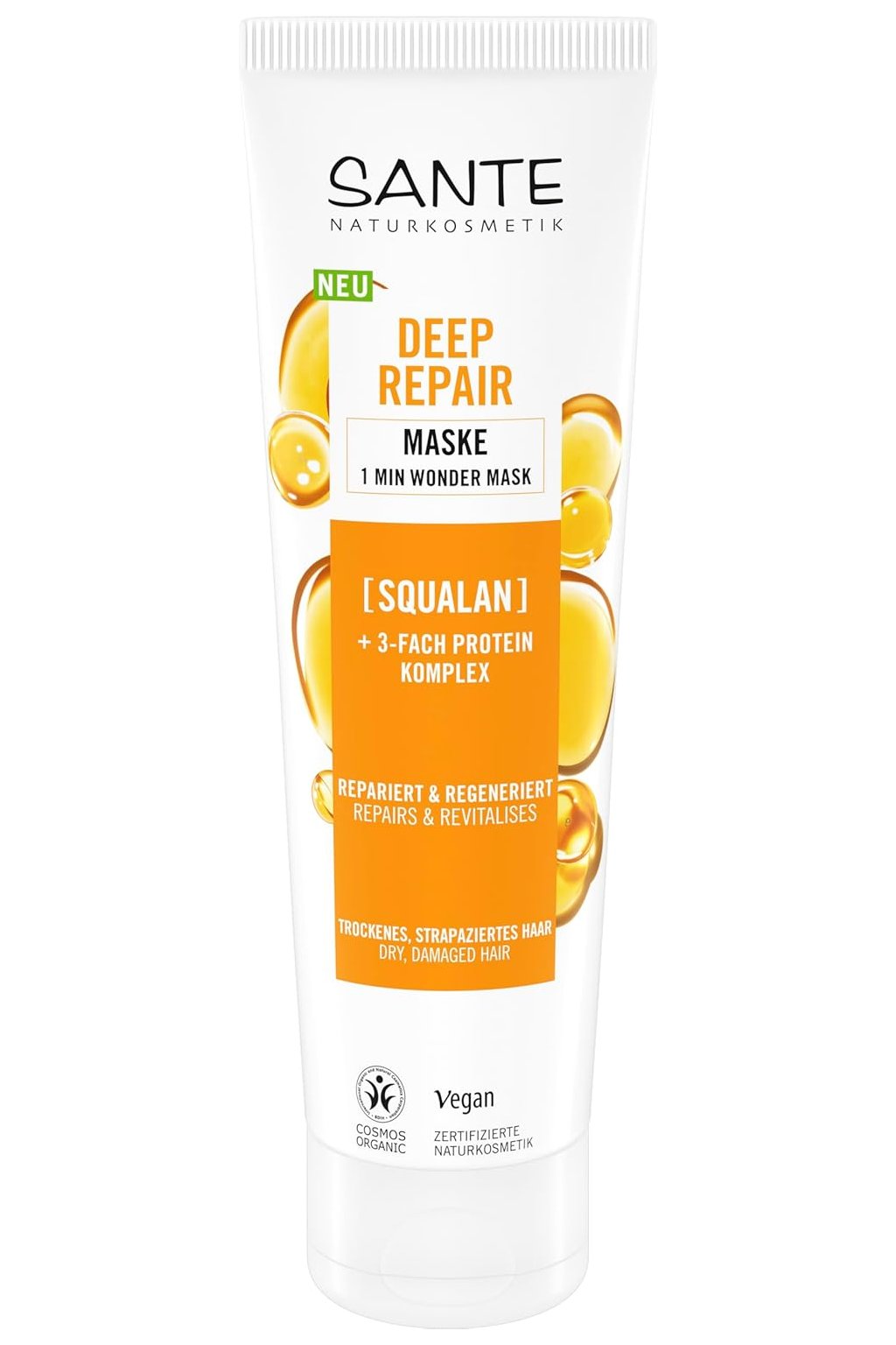 SANTE Naturkosmetik Hluboce regenerující 1-minutová zázračná maska 150 ml je intenzivní maska určená pro suché a poškozené vlasy, která již po jedné minutě poskytuje okamžitou regeneraci a pružnost. Obsahuje skvalen, který vyživuje a zjemňuje vlasová vlákna, a trojitý proteinový komplex, který proniká hluboko do vlasů, obnovuje jejich strukturu a posiluje je od kořínků až po konečky. Maska vyhlazuje povrch vlasů, zlepšuje lesk a chrání před poškozením způsobeným tepelným ošetřením nebo stylingem. Je vhodná pro každodenní použití, i pro citlivé a oslabené vlasy.