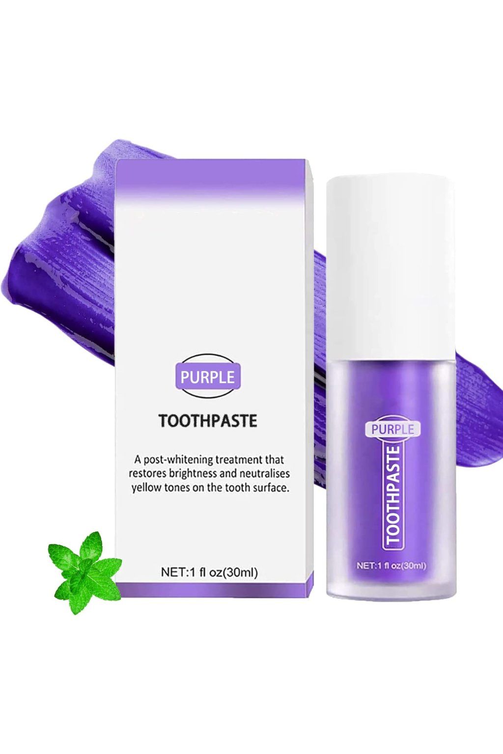 Fialová zubní pasta na bělení zubů využívá technologii korekce barvy, která neutralizuje žluté podtóny na zubech a výsledkem je jasnější a zářivější úsměv.