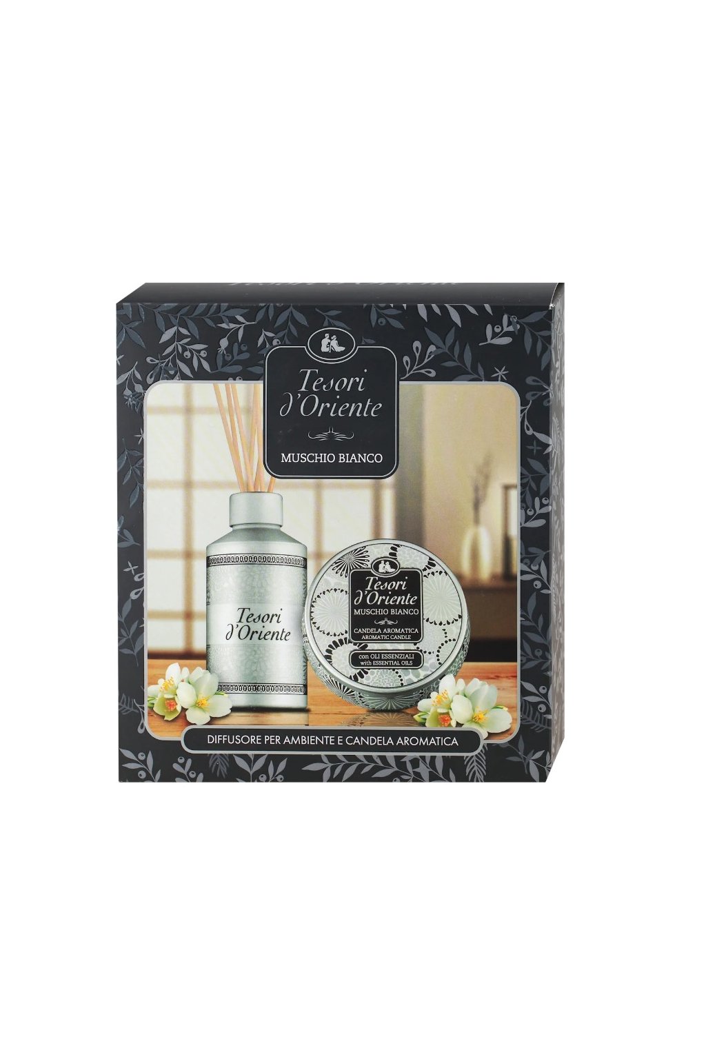 Tesori d’Oriente – Muschio Bianco aromatická svíčka a osvěžovač vzduchu je vůně, která přináší relaxační a elegantní atmosféru domova prostřednictvím kombinace vonné svíčky a osvěžovače vzduchu v jednom balení. Tato sada je inspirovaná tradičními orientálními vůněmi s jemným dotykem bílého pižma („Muschio Bianco“), která působí teple, čistě a harmonicky – ideálně pro odpočinek, relax nebo večerní pohodu doma.