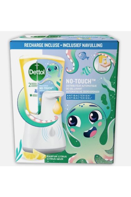 Sada obsahuje automatický dávkovač mýdla Dettol No Touch, náplň s vůní citronu o objemu 250 ml a 3 baterie AA.